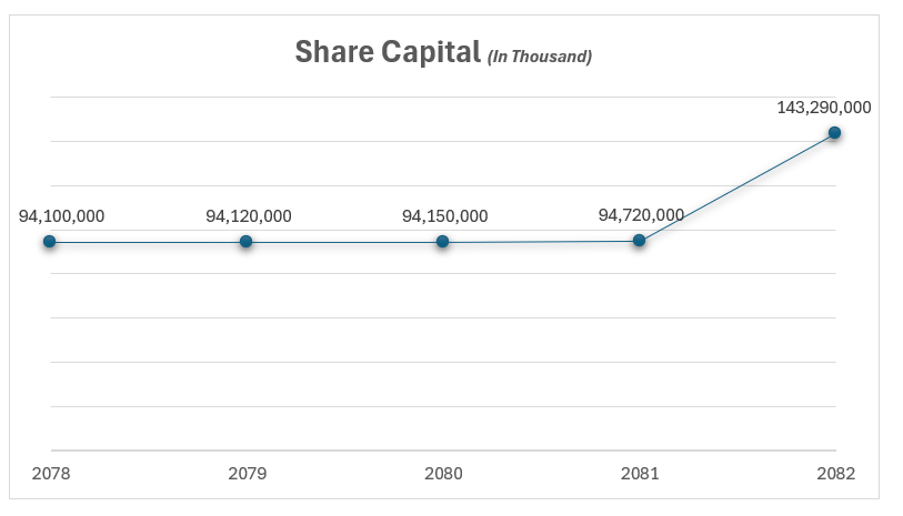 As of 2082, a total of 32,965 cooperatives hold a combined share capital of Rs. 143.29 billion. The average share capital per cooperative stands at Rs. 4,346,731. On a per-member basis, the average shareholding amounts to Rs. 13,140.