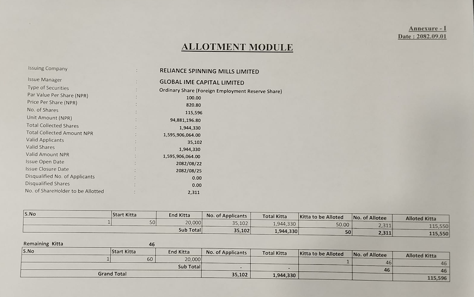 Reliance Spinning Mills Limited Concludes IPO Allotment for Nepalese Citizens Working Abroad; 2,311 Applicants Receive 50 Units, 46 Get One Unit Each via Lottery