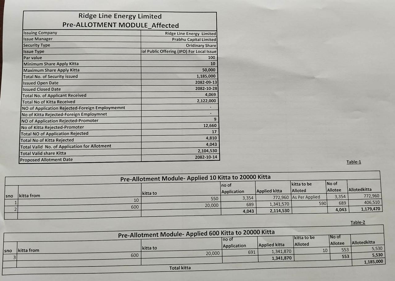 The IPO allotment for Project-Affected Locals of Gorkha and Lamjung by Ridge Line Energy Limited was concluded today, 14th Magh, 2082.