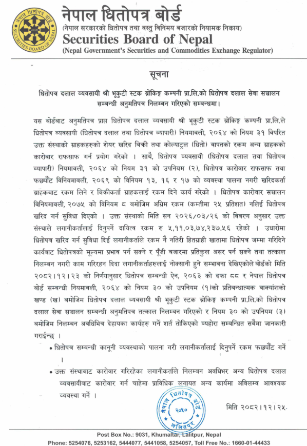 The Securities Board of Nepal (SEBON) has issued a formal notice announcing the immediate suspension of the brokerage license for Bhrikuti Stock Broking Company Pvt. Ltd. This decision follows a series of serious regulatory violations, most notably the misuse of client funds where the broker used one group of investors' money to settle the trades of others. Additionally, the firm failed to follow standard settlement procedures and illegally allowed clients to purchase shares without the required 25% advance payment.
