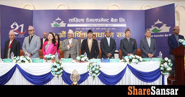 Shangrila Development Bank Limited (SADBL) held its 21st Annual General Meeting on 7th Poush, 2082, in Kathmandu. The AGM approved a total dividend of 10.3583%, comprising 5.3583% cash dividend and 5% bonus shares, raising the bank’s paid-up capital to NPR 3.734 billion.