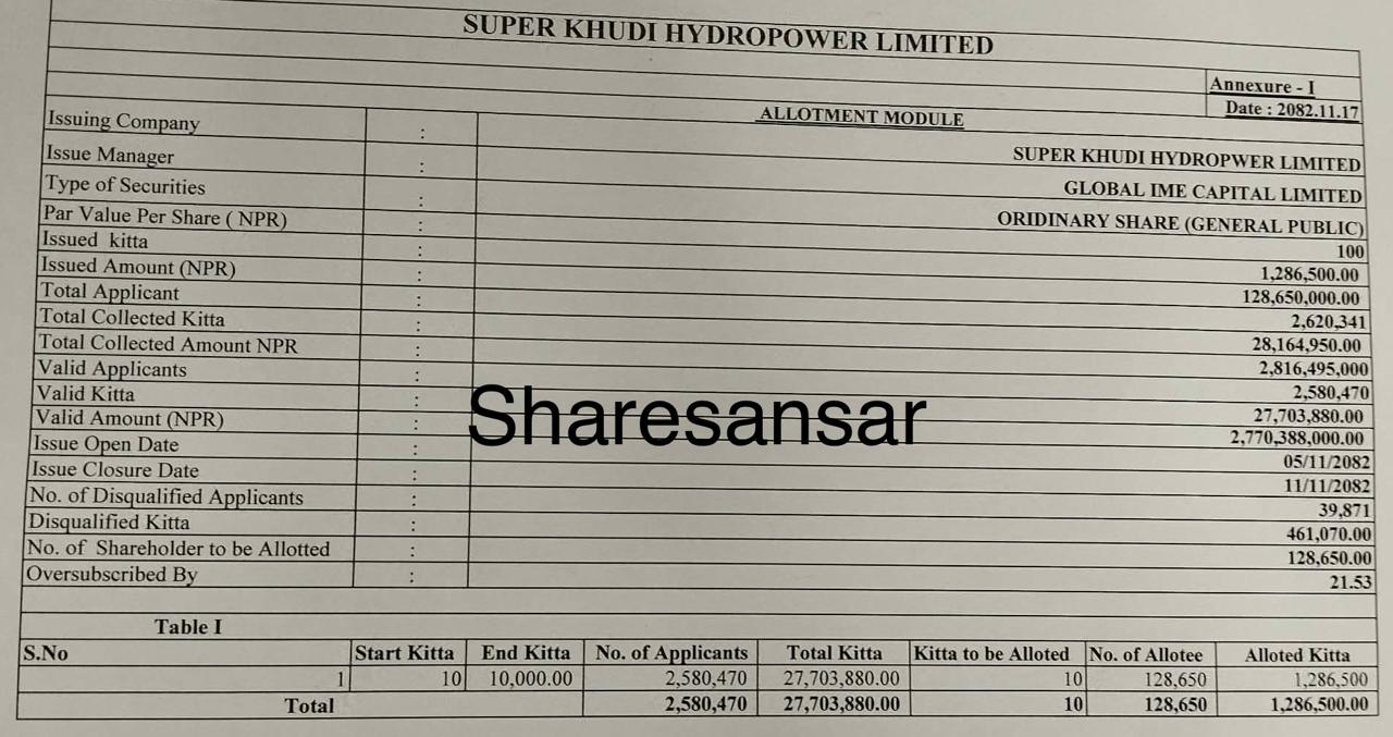 Super Khudi Hydropower Limited IPO Allotment Concludes: Lucky 1,28,650 Applicants Allotted 10 Units Each via Lottery System