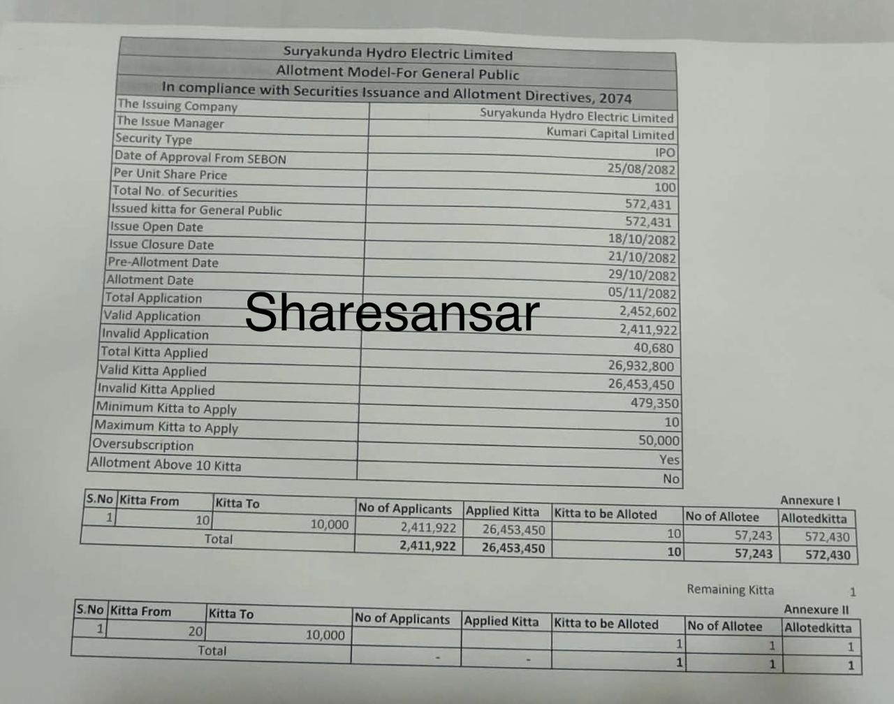 Suryakunda Hydro Electric Limited's IPO allotment was concluded today at the premises of the issue manager, Kumari Capital, Nagpokhari, Kathmandu.