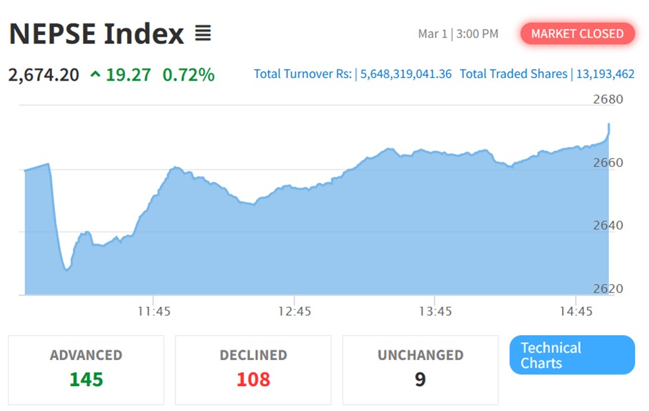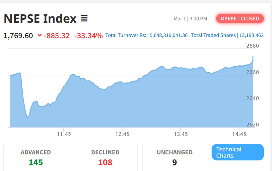 The index is reported to have fallen 885.32 points (33.34%) in a single trading day on Sunday, closing at 1769.60 points. However, NEPSE later confirmed that the market actually surged 19.27 points (0.72%) to close at 2674.20 points.