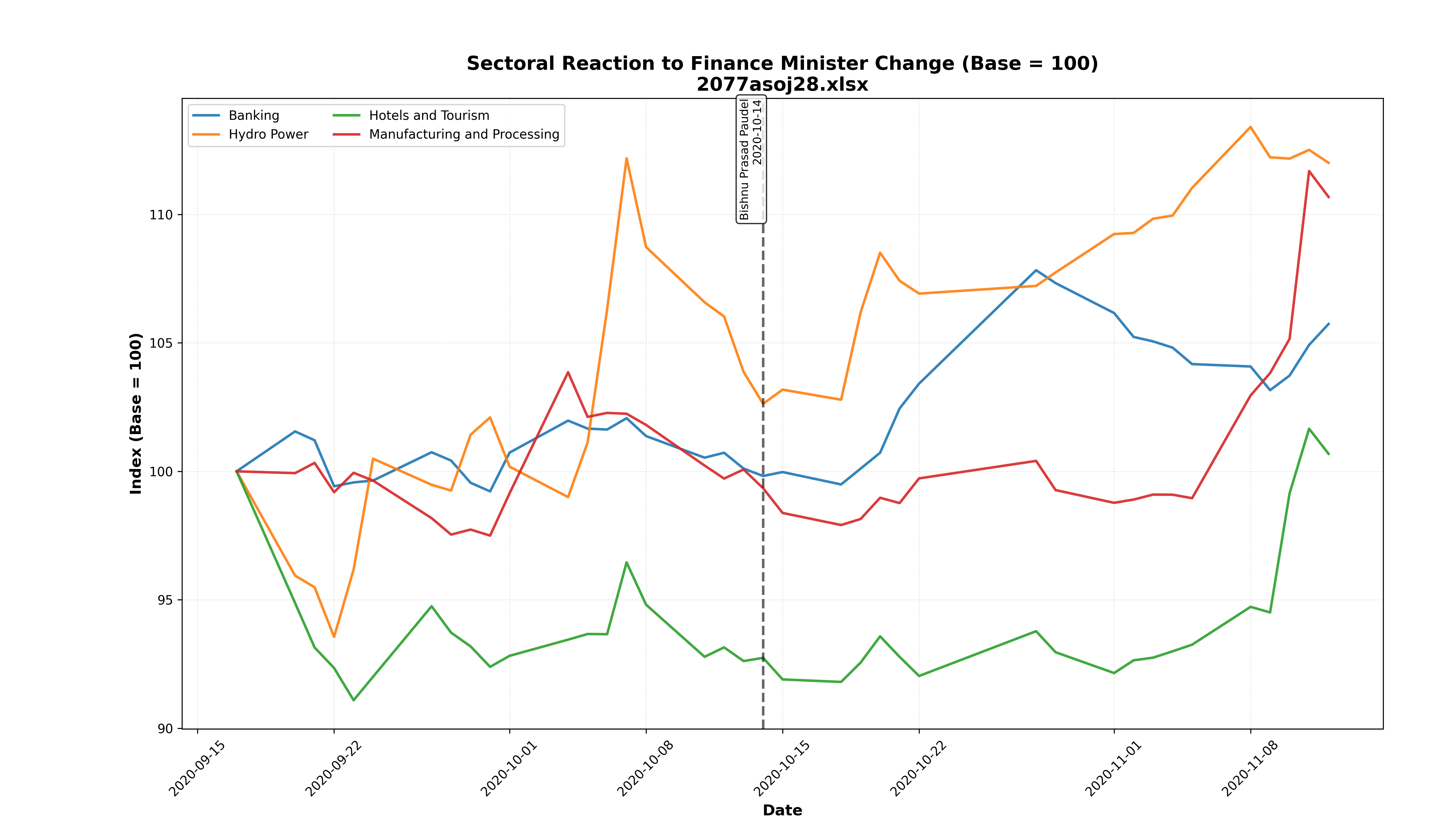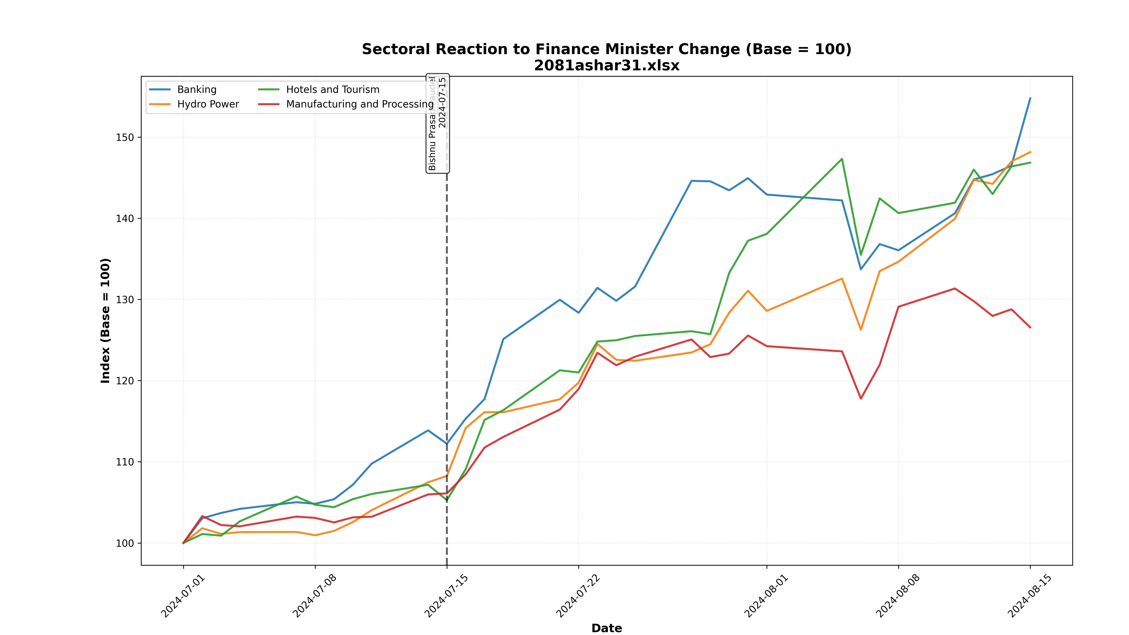 - Key Finding: Hotels and Tourism was the only sector that managed to stay consistently above the 100 base, while Banking and Hydro reached lows of ~94.