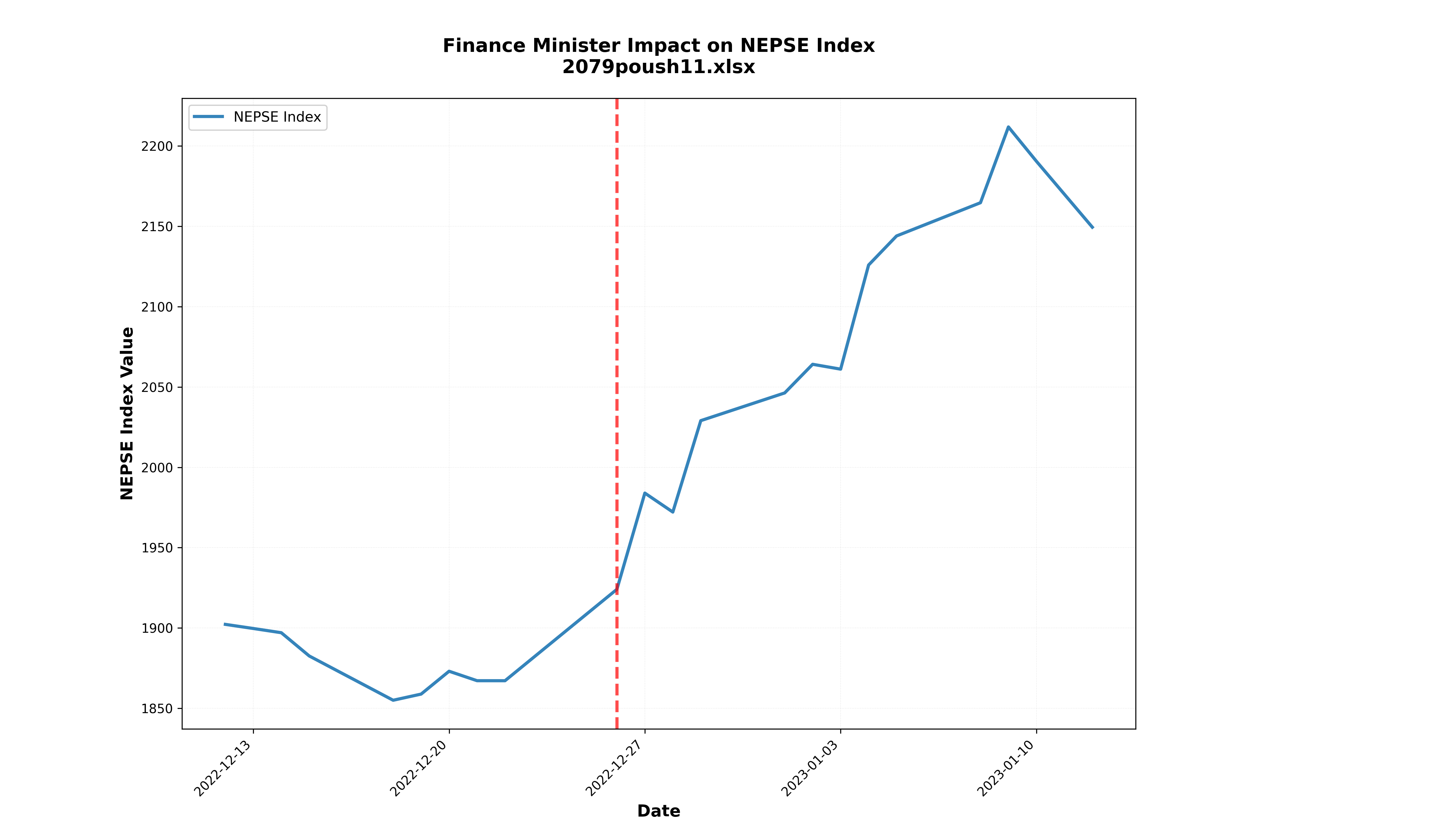 For each Finance Minister appointment, two graphs are used: one showing the NEPSE Index and another showing sectoral indices rebased to 100 to capture relative changes. A vertical dotted line indicates the date of the Finance Minister’s appointment.