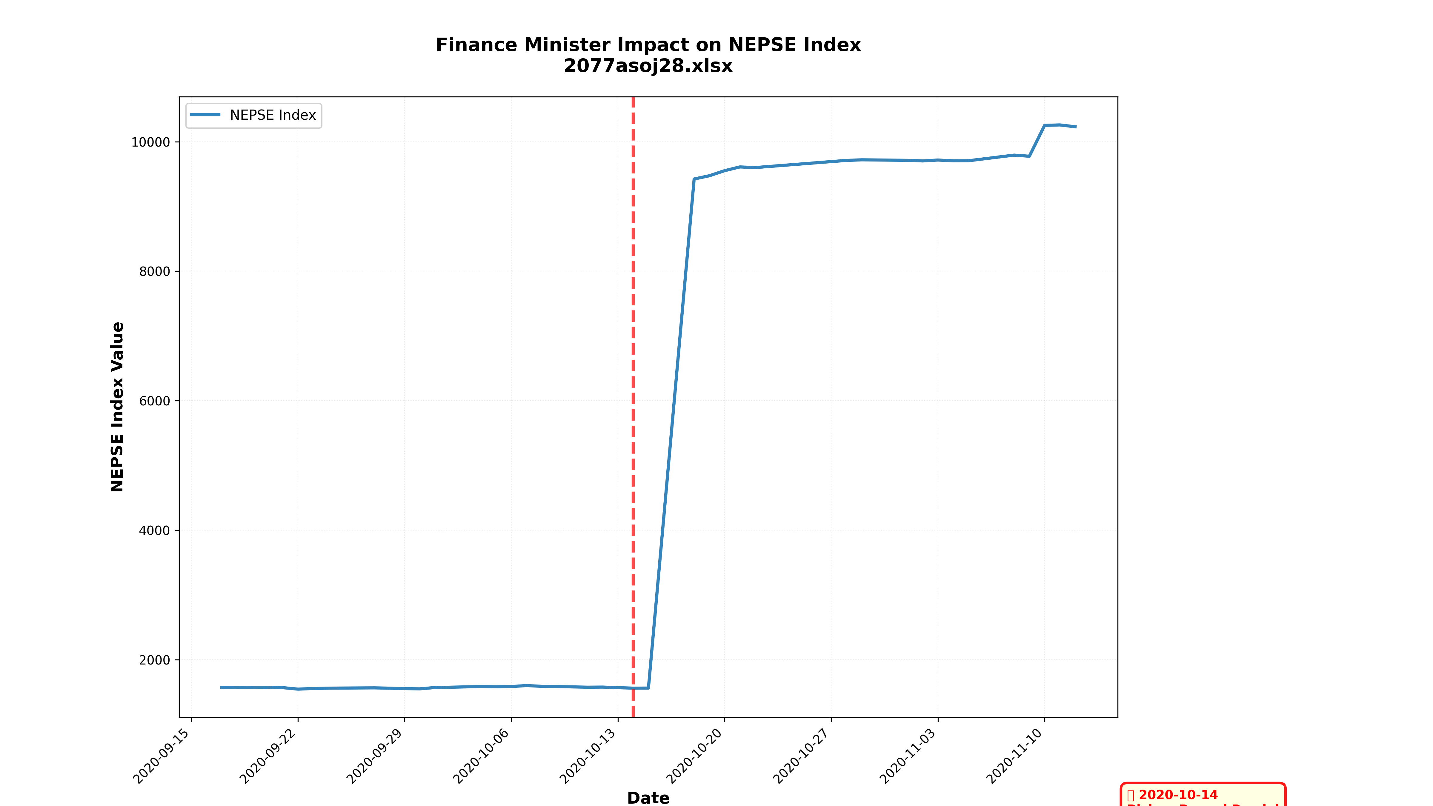 This study examines eight Finance Minister leadership changes between 2074 BS and 2082 BS (2018–2025 AD) to assess their immediate impact on the NEPSE index. The analysis indicates that macroeconomic conditions provide the foundation for market movements, while the Finance Minister’s perceived ideology and policy stance function as the trigger influencing investor confidence.