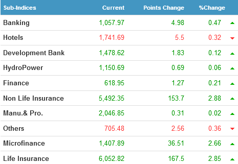 Hotels and Others were the only sub-indices in the red zone after losing 0.32% and 0.36% respectively. Rest of the sub-indices gained points with Non-Life Insurance gaining the most at 2.88% or 153.70 points.