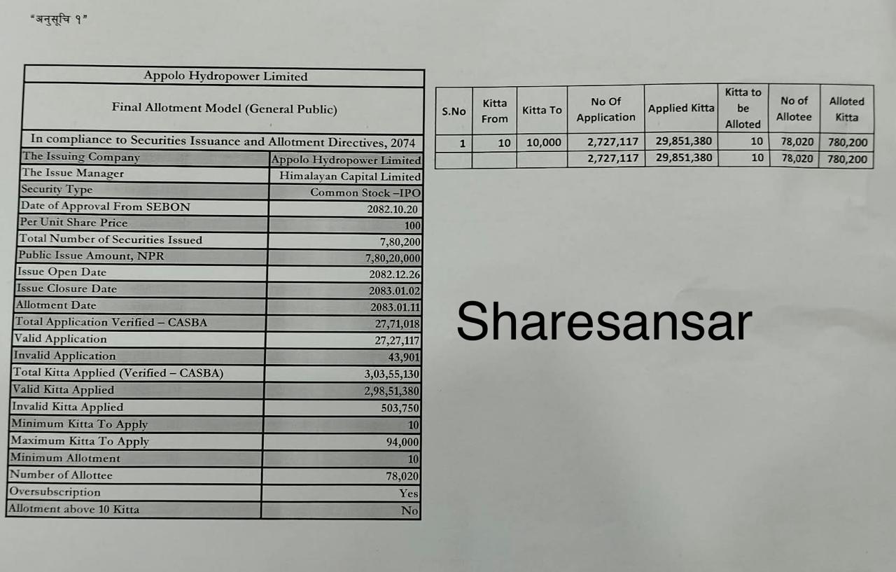 Appolo Hydropower Limited IPO Allotment Concludes: Lucky 78,020 Applicants Allotted 10 Units Each via Lottery System