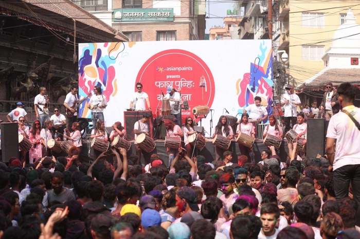 Asian Paints Nepal, one of the largest paint companies in Nepal, has celebrated the festival of colors, Holi, in association with KMC Ward No. 24 and Kutumba Band on March 6th, at Indra Chowk, Kathmandu. The event was aimed to uplift and showcase the Newa culture and community through the cultural band, Kutumba.