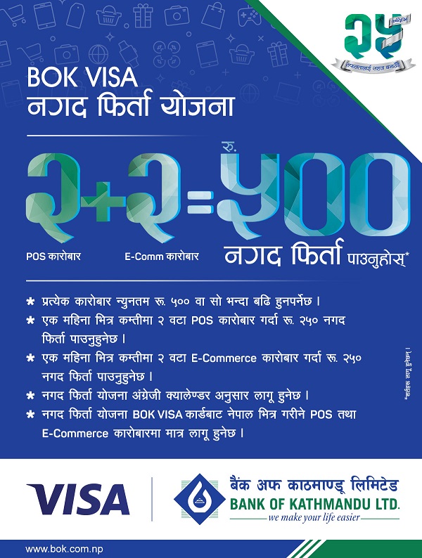 Bank of Kathmandu has launched its Visa Cashback scheme for its customers where its card users can receive cash back up to Rs 500 for the payment they make through their cards at POS machines and at e-commerce platforms.