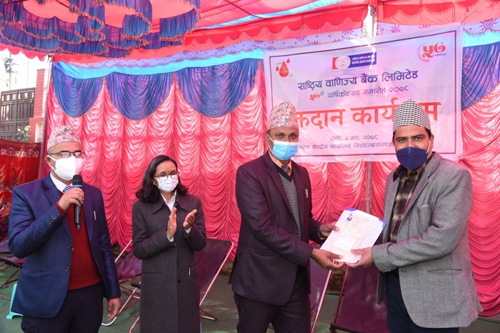 On the occasion of the 57th anniversary of Rastriya Banijya Bank Limited, a blood donation program was held at the central office premises and various provincial offices of the bank on Wednesday.