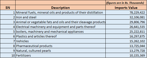 Top ten imported goods by Nepal during the first three-month of the Fiscal Year