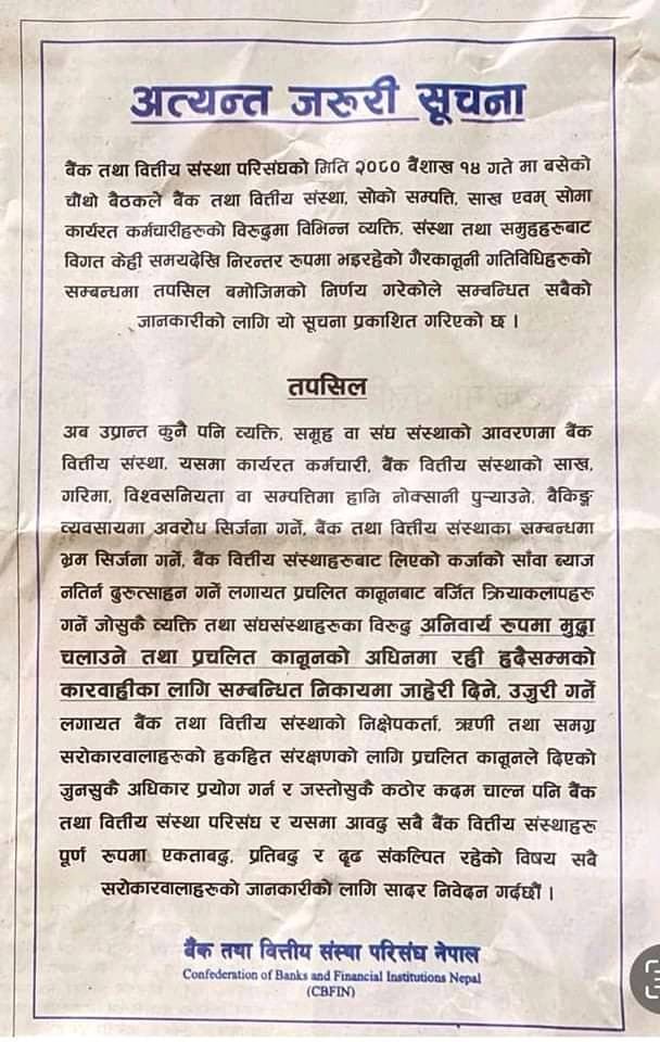 Confederation of Commercial Banks and Financial Institutions Nepal (CBFIN) has stated that the CBFIN is fully united, committed, and determined to use any legal authority provided by the current law and take any drastic measures for the protection of the rights and interests of the depositors, borrowers, and other stakeholders of the Bank and Financial Institutions.
