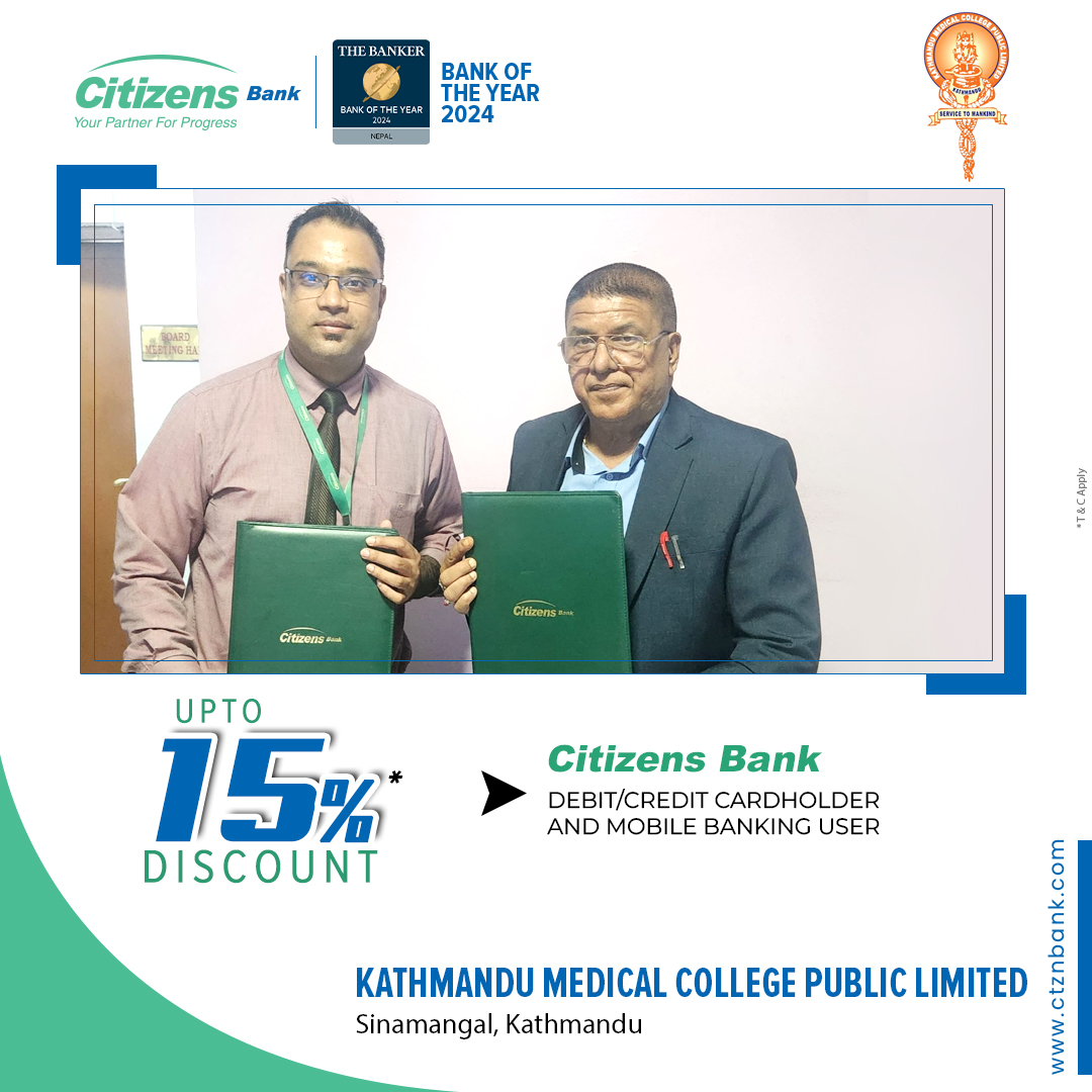 Citizens Bank International Limited (CZBIL) has signed an agreement with Kathmandu Medical College, Sinamangal, to provide its cardholders and mobile banking customers with up to 15% discount on specialist medical services. The collaboration aims to promote digital transactions over cash payments.