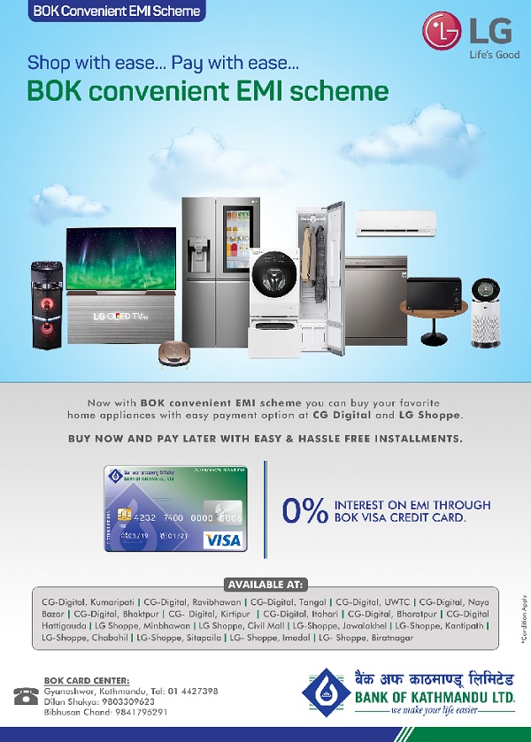 Bank of Kathmandu has inked an agreement with CG Digital in order to facilitate its credit card users in purchasing all sorts of electronic goods and home appliances of CG, LG, Godrej, TCL, Sensei, Elica, Kent brands with easy EMI facility.