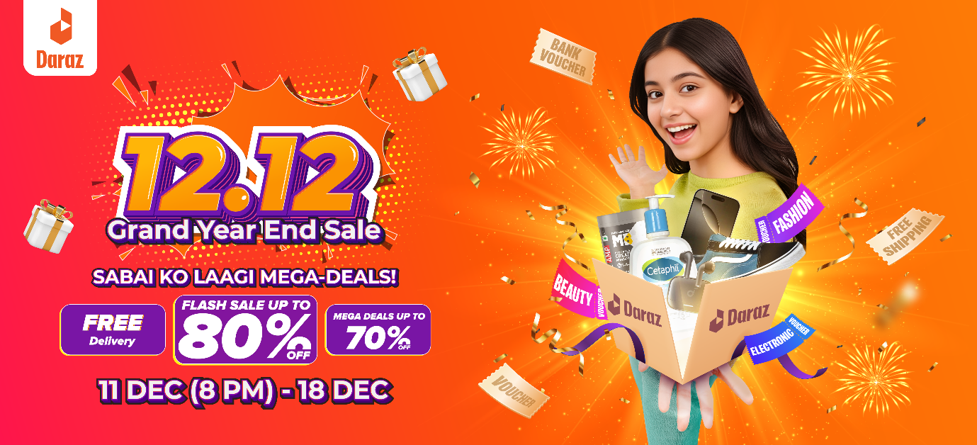 Daraz Nepal has launched its 12.12 Grand Year-End Sale, running from December 11 to 18, offering major discounts, including flash sales up to 80% off, mega deals up to 70% off, and exclusive partner offers. The event features the Crazy Flash Sale, rush-hour discounts for Khalti users, and multiple giveaway opportunities through Add to Cart & Win and Buy & Win.