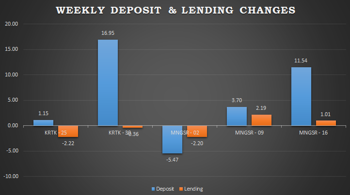 Compared to the previous week's report, the overall amount of lending has gone up by Rs. 1 billion, reaching Rs. 4223 billion. Lending of Rs. 4194 billion has been sent in local currency, while Rs. 29 billion has been sent in foreign currency.