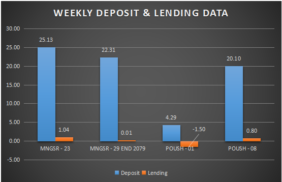 Compared to the previous week's report i.e Poush 1, 2079, the overall amount of lending has inclined by Rs. 80 Million, reaching Rs. 4223 billion. Lending of Rs. 4194 billion has been sent in local currency, while Rs. 29 billion has been sent in foreign currency.
