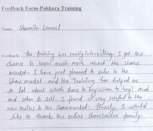 IMS Investment Management Services Pvt. Ltd., parent company of ShareSansar.com, has been running training on Stock Market in Kathmandu Valley. ShareSansar has successfully conducted Share market training in Pokhara from Poush 30 to Magh 02. Following are the selected feedback from the participants of the share market training: