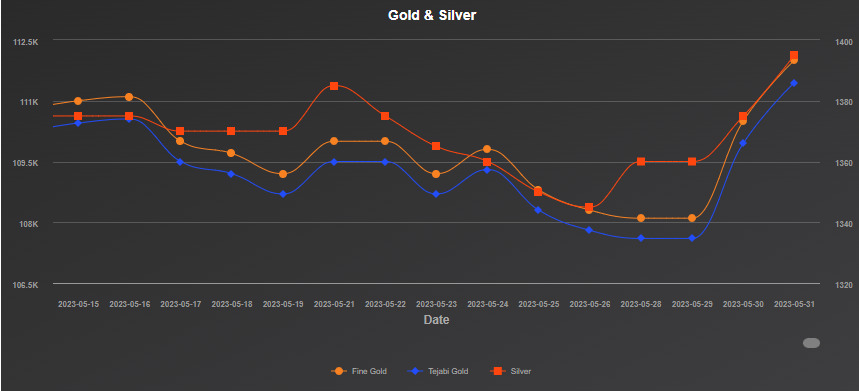 Recently, the price of gold made an all-time high in the Nepalese market on 4th May 2023. Fine gold traded at Rs. 111,800 per tola while tejabi gold was traded at Rs. 111,250 per tola that day.