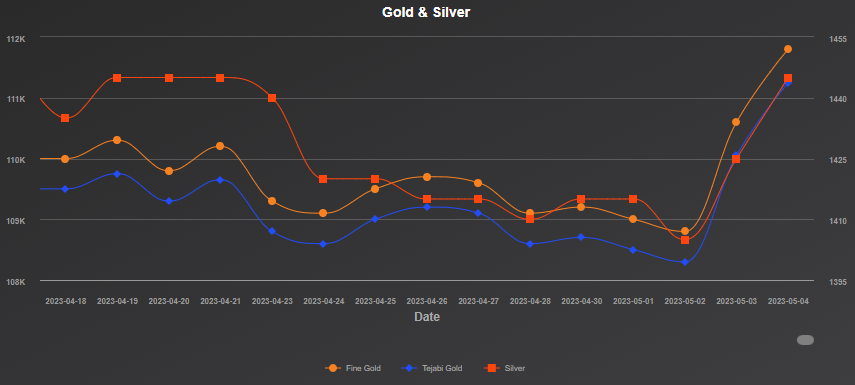 Recently, the price of gold made an all-time high in the Nepalese market on 5th April 2023. Fine gold traded at Rs. 111,000 per tola while tejabi gold was traded at Rs. 110,450 per tola that day.