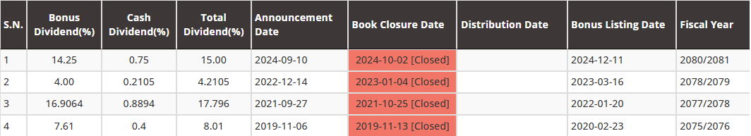 The 155th meeting of the board of directors held on Ashwin 08 decided to distribute the dividend from the paid-up capital of Rs. 11.58 crores. 14.25% bonus shares worth Rs. 1.65 Crores and 0.75% cash dividend (including tax) worth Rs. 8,68,871.75 have been proposed.