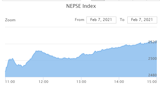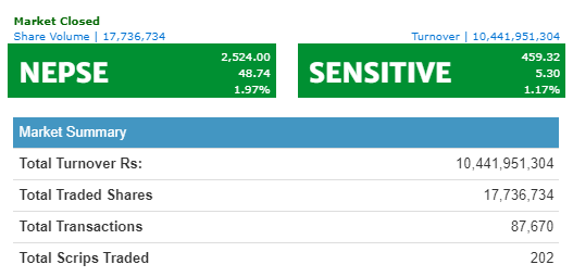 The NEPSE index gained 48.74 points today and closed at 2,524.00. This is the highest index closing in the history of NEPSE. The index opened at 2,486.79 which is also the intraday low. The market close is the intraday high itself.