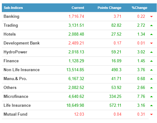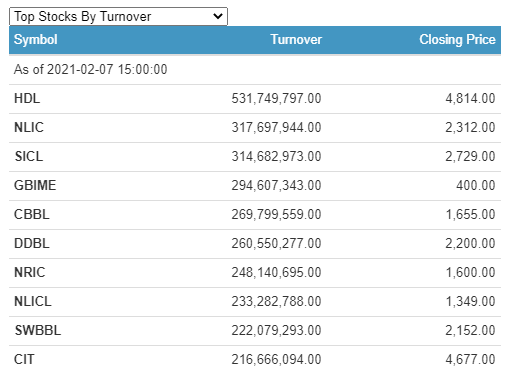 17,736,734 shares traded hands via 87,670 transactions. The trading of 202 scrips brought the total market turnover to a little over Rs. 10.44 Arba. This is the highest intraday turnover in the history of NEPSE. While the float index gained 3.06 points and closed at 171.14, the Sensitive index is at 459.32 after gaining 5.3 points.