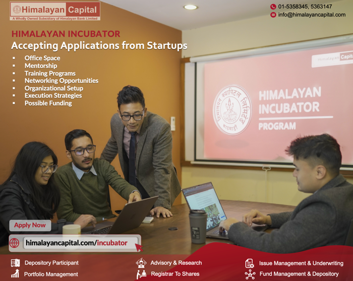 Himalayan Capital Limited, a wholly owned subsidiary of Himalayan Bank Limited has launched “Himalayan Incubator” as a platform for entrepreneurs, providing free workspace, training, and guidance. Startups shall be facilitated through continuous interactions and guidance by the organization’s advisory and research wings. The startups/ entrepreneurs shall be provided structured trainings on operationalizing companies, framing business models, scaling businesses, and raising finances.