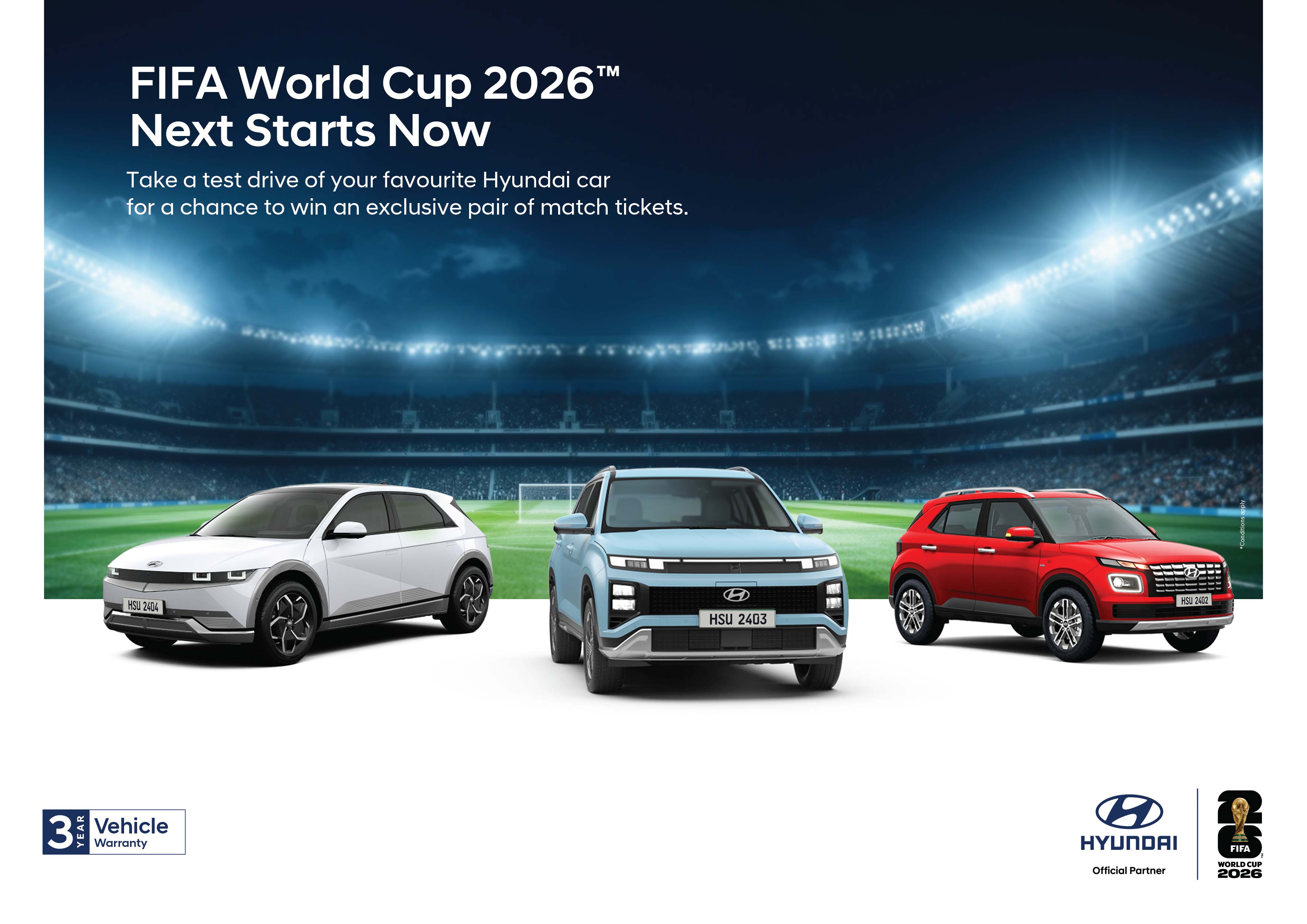 Customers who test drive any Hyundai vehicle at authorized showrooms will get a chance to win a trip to watch a FIFA World Cup 2026 match live in the United States, Canada, or Mexico, along with a companion.