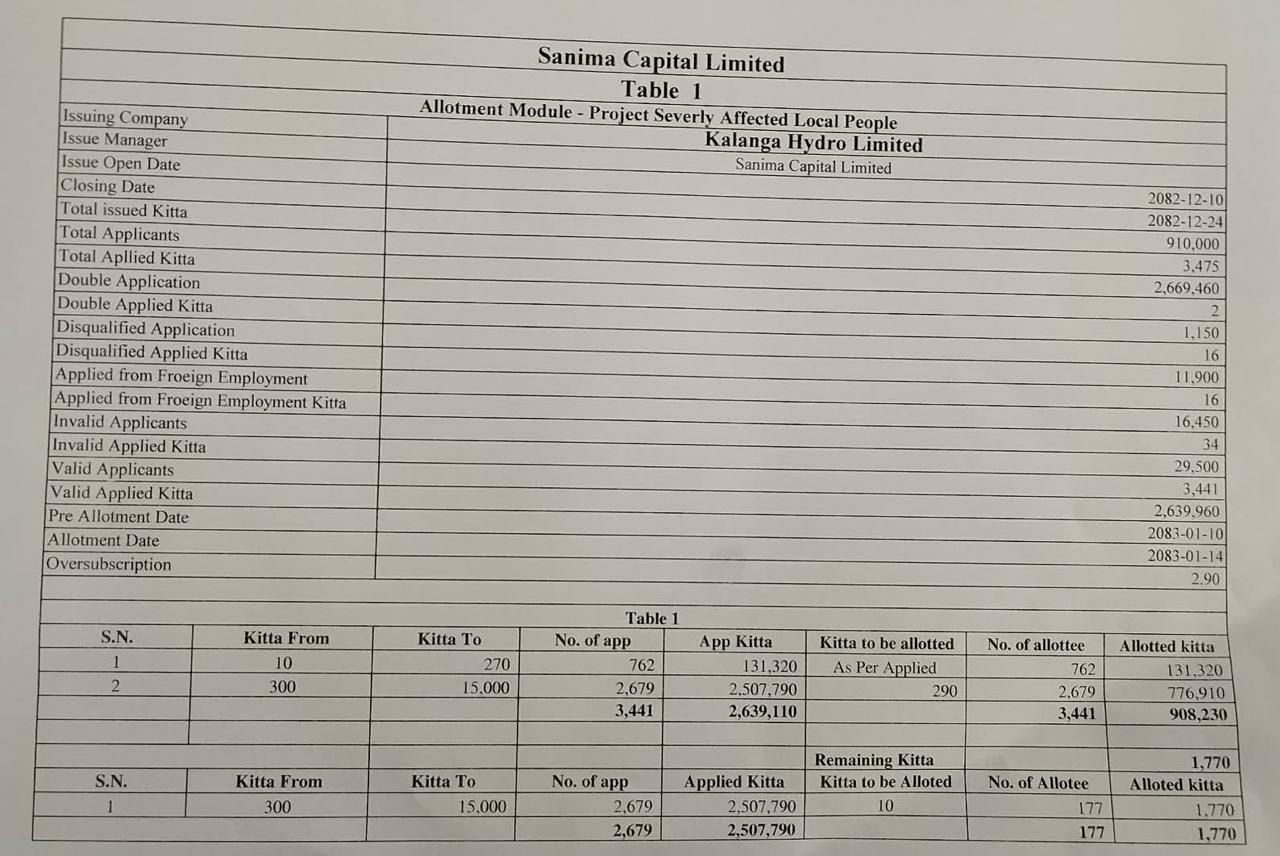 The IPO allotment for Project-Affected Locals of Bajhang District by Kalanga Hydro Limited was concluded Yesterday, 14th Baishakh, 2083.