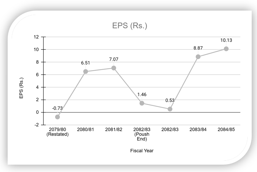 The company reported a loss of Rs. 0.73 per share in FY 2079/80, which was the early construction phase. It recovered strongly to Rs. 6.51 in 2080/81 and Rs. 7.07 in 2081/82, reflecting improving pre operational income and reduced losses. The projected EPS dips to Rs. 0.53 in 2082/83 the year of commercial operation commencement primarily due to heavy interest and depreciation charges in the initial production year. However, it is projected to grow significantly to Rs. 8.87 in 2083/84 and Rs. 10.13 in 2084/85 as revenue stabilises and debt servicing normalises, reflecting the long-term earnings potential of the project.