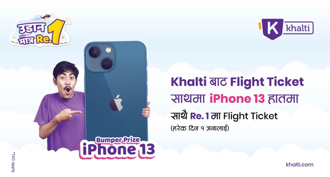 Nepal's popular online Payment Service Provider (PSP), Khalti Digital Wallet, and Payment Gateway have brought its huge success campaign “ udaan aba matra Ru. 1” back, in which, a bumper prize of iPhone 13 on the purchase of flight tickets. Along with this, 1 user will win flight tickets at Re. 1 daily and 1Lakh Khalti Points for 5 people weekly.