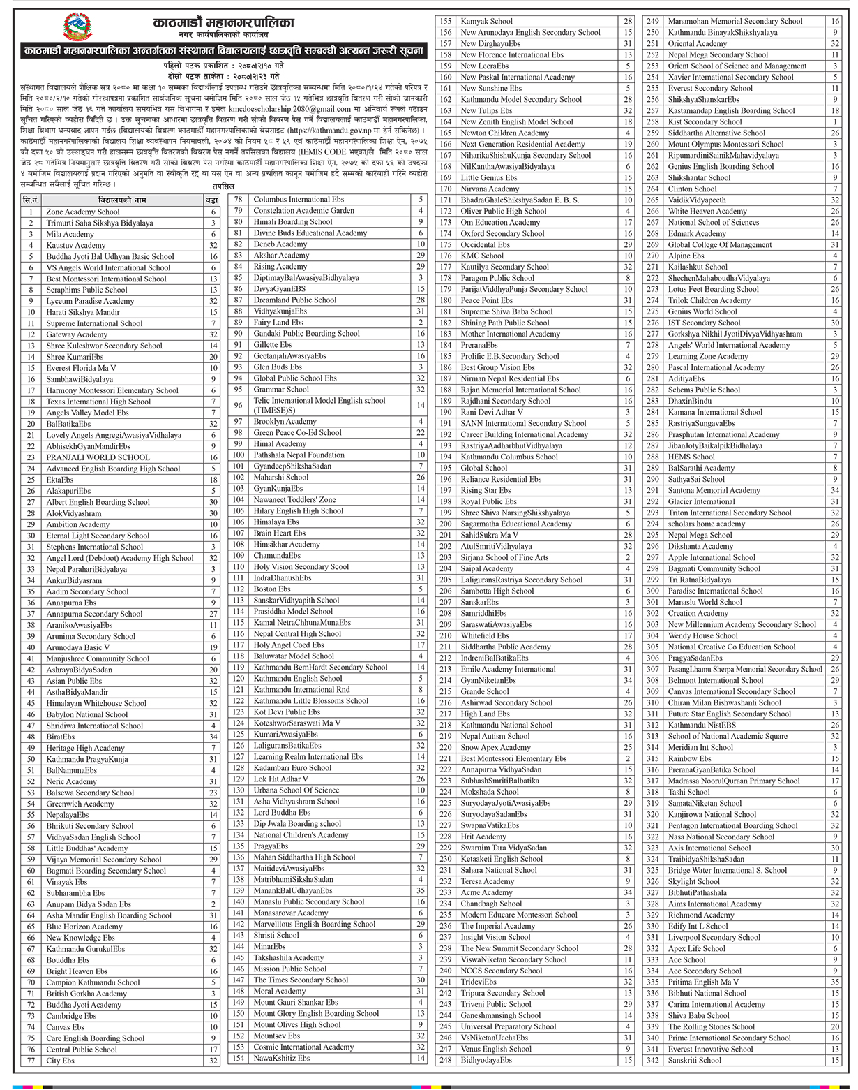 Kathmandu Metropolitan City (KMC) has issued a stern warning to institutional schools for their failure to submit scholarship distribution details. The Metropolitan Office, responsible for overseeing educational institutions within its jurisdiction, had previously issued a notice on Jestha 10, requesting schools to provide the necessary information. However, despite the initial notice, a staggering 342 schools have not complied with the requirement within the specified time.