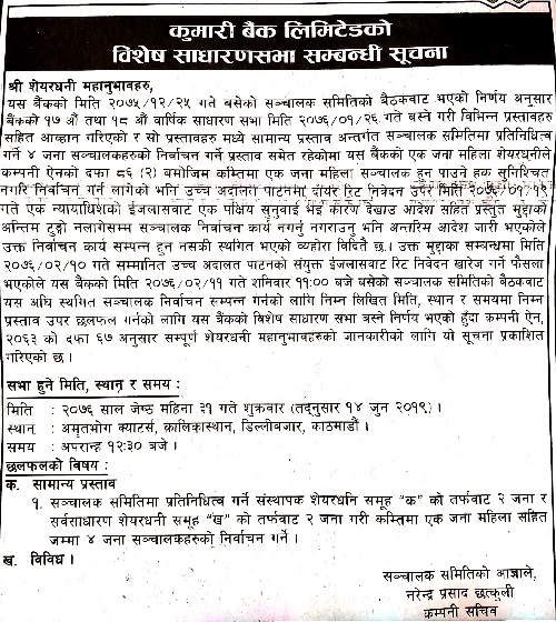 Kumari Bank Limited (KBL) will be convening special general meeting (SGM) on Jestha 31, 2076. The meeting will be convened in the premises of Amrit Bhog Catering, Kaliskathan, Kathmandu at 12:30 PM.