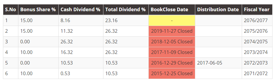 The company's 128th meeting of the board held on Poush 03 has proposed an 8.13% cash dividend and a 15% bonus shares from the paid-up capital. The paid-up capital of the company is Rs. 27,83,00,000. Thus, the cash dividend amounts to Rs. 2,27,03,421 and the bonus shares are worth Rs. 4,17,45,000.