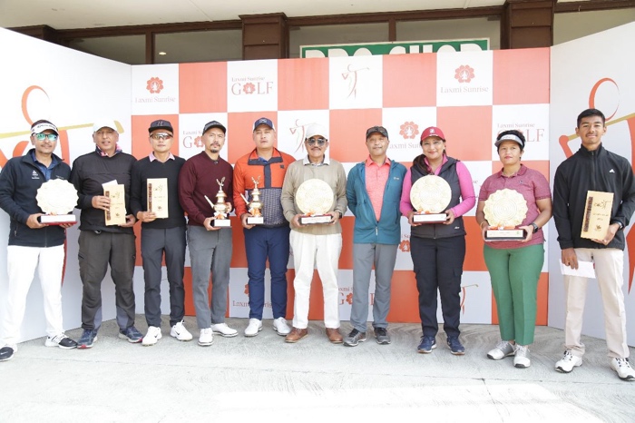 Tashi Dong bagged the best gross award after carding 39 gross points. Sumitra Khadka was winner among ladies with 34 points and Aarti Rana finished runner-up with 33 points. Maj Gen (retd) Mahesh Bikram Karki was senior winner (age 60 and above) with 34 points on the count back after being tied with Tendi Sherpa. Sadbhav Acharya got the longest drive award, Tahir Shah got closest to the pin and Wangchen Dhondup got most birdies award with four birdies and one eagle. Bijay Bahadur Shrestha got the most elegant golfer award for wearing the Laxmi Sunrise color outfit.
