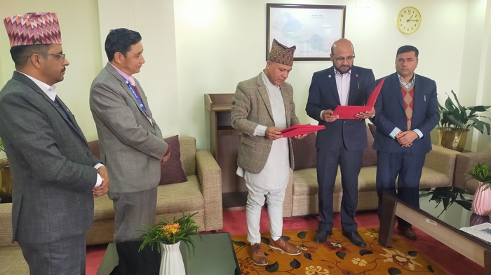 Chairman Mr. Bhattarai received his oath of secrecy and designation from Deputy Governor of Nepal Rastra Bank Mr. Bom Bahadur Mishra on Poush 28, 2079.