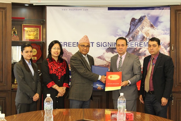 Machhapuchchhre Bank Ltd has entered into an agreement with Guras Life Insurance Company Limited as its agent to sell Insurance policies. The Agreement was signed by Deputy Chief Executive Officer of the Bank Mr. Santosh Koirala and Assistant General Manager in the life Insurance Mr. Bal Mukunda Rupakheti on Chaitra 26, 2075.