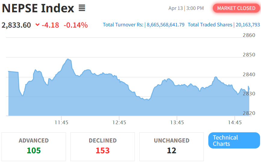 The Nepal Stock Exchange (NEPSE) recorded a small fall today, falling by 4.18 points (0.14%) to settle at 2,833.60.