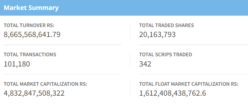 The benchmark index opened at 2,842.73 touching an intraday high of 2,849.09, while the lowest point was 2,827.06. Total turnover for the day reached Rs. 8.66 Arba, with 20,163,793 shares traded across 342 companies through 101,180 transactions. Market capitalization stood at Rs. 48.32 Kharba, with a float market capitalization of Rs. 16.12 Kharba.