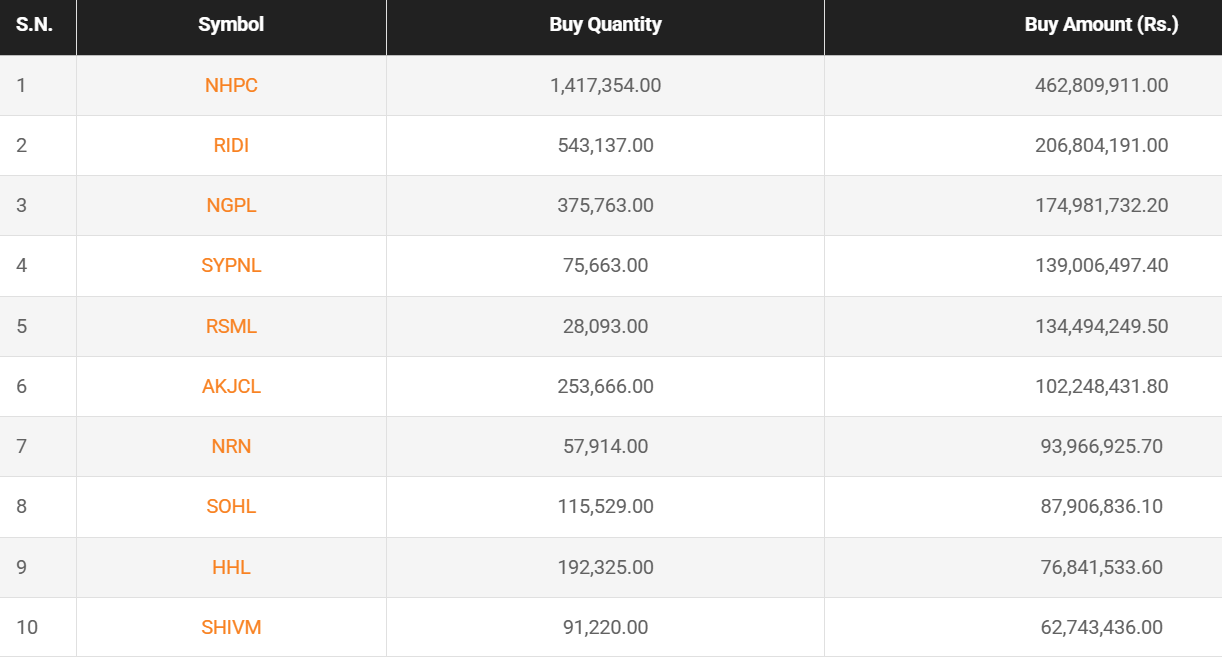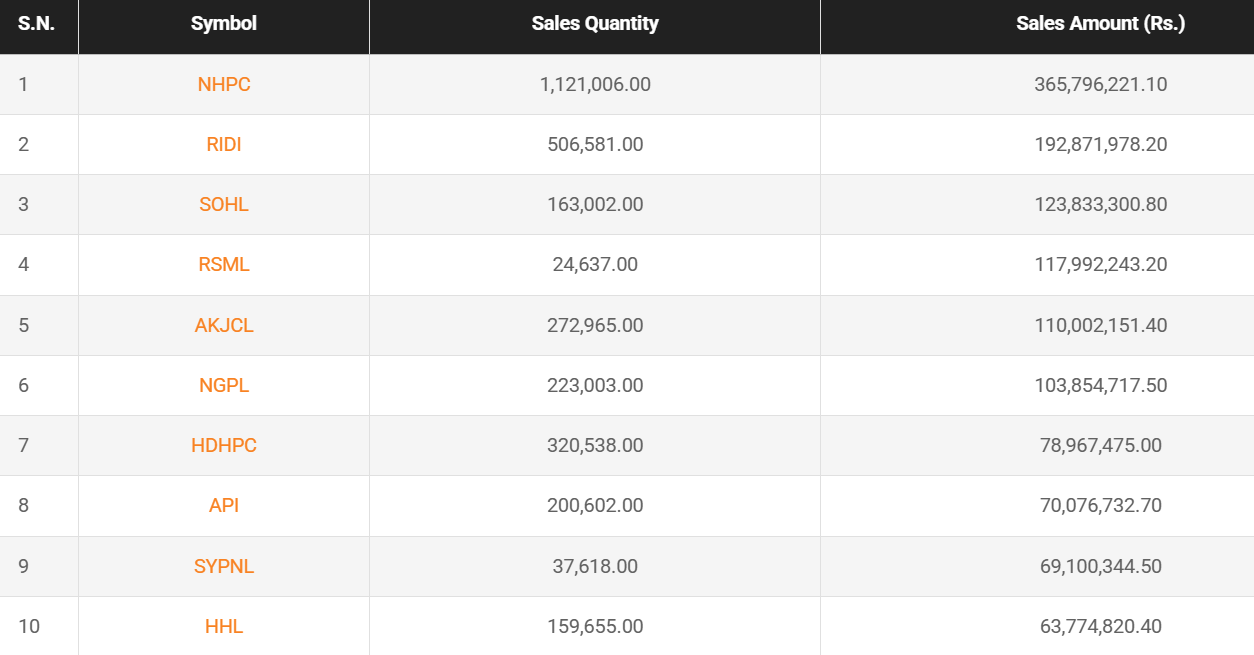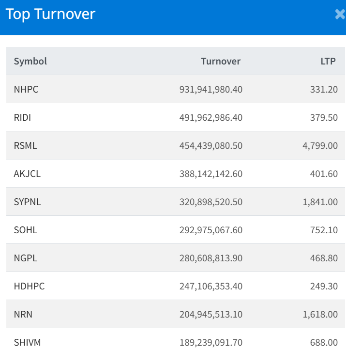 National Hydropower Company Limited topped the turnover chart, amounting to Rs. 93.19 crores. The stock closed at Rs. 331.20.