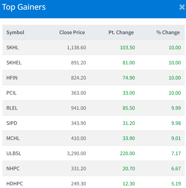 Five companies hit the positive circuit of 10% each that includes SKHL, SKHEL, HFIN, PCIL and RLEL.
