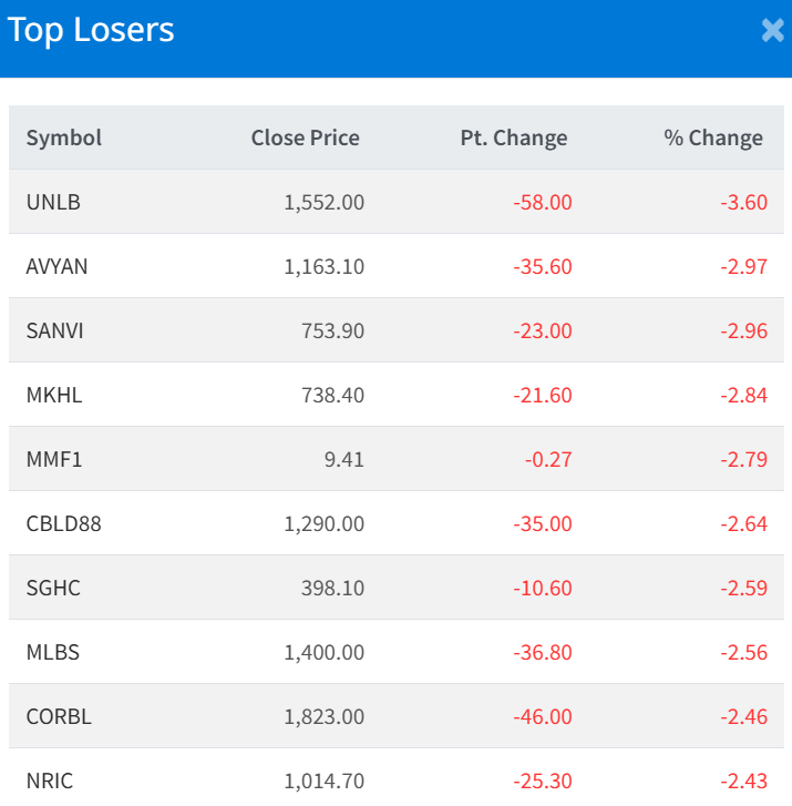 Unique Nepal Laghubitta Bittiya Sanstha Limited recorded the highest fall, falling by 3.60% and the stock closed at Rs. 1,552 points.