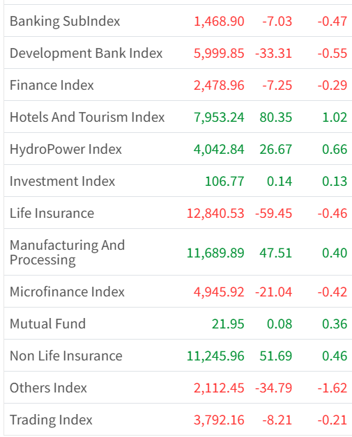 Among the sector highest gain is recorded in Hotel and Tourism Index, rising by 1.02% and Lowest fall is recorded in Trading Index, the index fall by 0.21%.