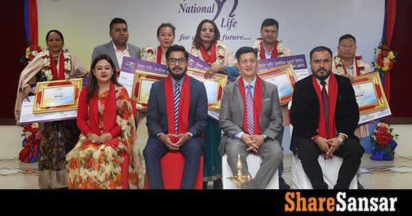 National Life Insurance Company Limited organized a CEO Club member recognition program at Mithila Yatri, Janakpur, led by CEO Suresh Prasad Khatri. The event honored 77 top-performing agents from Madhesh Province who met their FY 2081/82 insurance collection targets, along with departmental and branch heads.