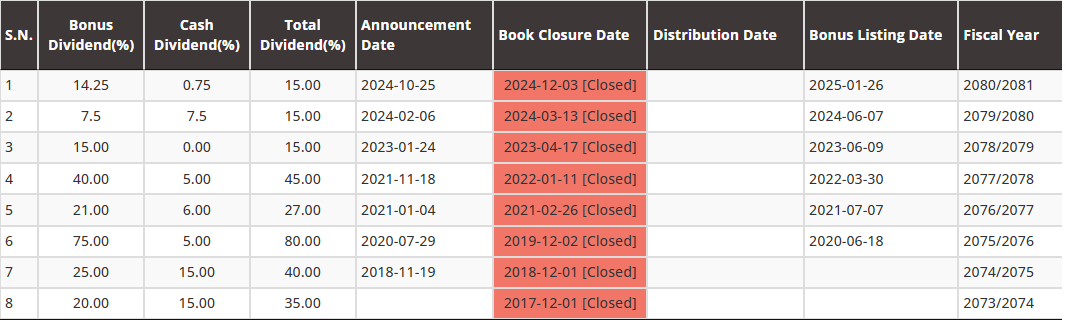 The 196th board of directors meeting on Poush 01 decided to distribute the dividend on the paid-up capital of Rs. 1.33 Arba. 14.25% bonus shares and 0.75% cash dividend (for tax purposes) have been proposed. Thus, the bonus shares are worth Rs. 18.97 crores, and the cash dividend is worth Rs. 99.87 lakhs.
