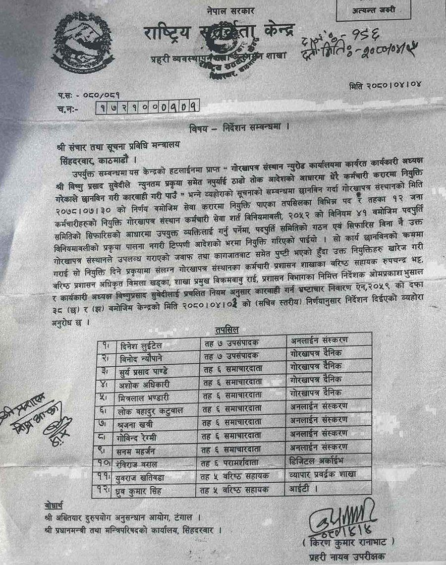 The National Vigilance Centre has directed the Ministry of Communication and Information Technology to revoke the appointment of 12 individuals hired on a contract basis at the Gorkhapatra Corporation. Additionally, the Centre has called for action to be taken against five people, including the Executive Chairman of Gorkhapatra Corporation, Bishnu Prasad Subedi, citing that their appointments were made against the law and established procedures.