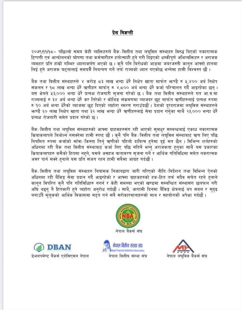 With respect to numerous disparaging remarks and agitational statements made by some people against banks, financial institutions, and microfinance organizations as well as the threatening gestures and disorderly behavior used to intimidate the staff, Nepal Bankers Association in coordination with Development Bankers Association, Nepal Microfinance Association, and Nepal Finance Association has released a statement regarding their view in the ongoing matter. According to them, the state's focus has moved to timely management of the chaotic situation in which people are taking the law into their own hands while disguising their actions as resistance.